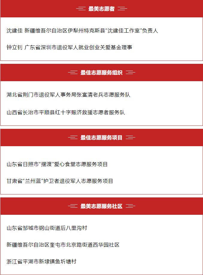 5月11日,2021年度全国学雷锋志愿服务“四个100”先进典型名单公布,退役军人事务部推荐的9个先进典型榜上有名。