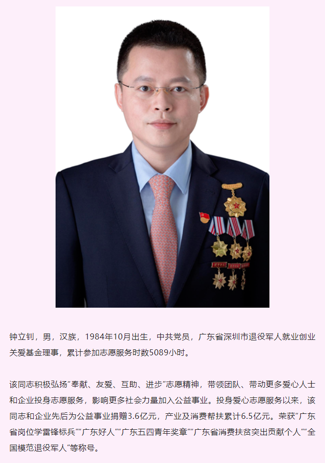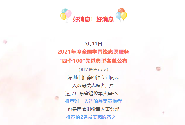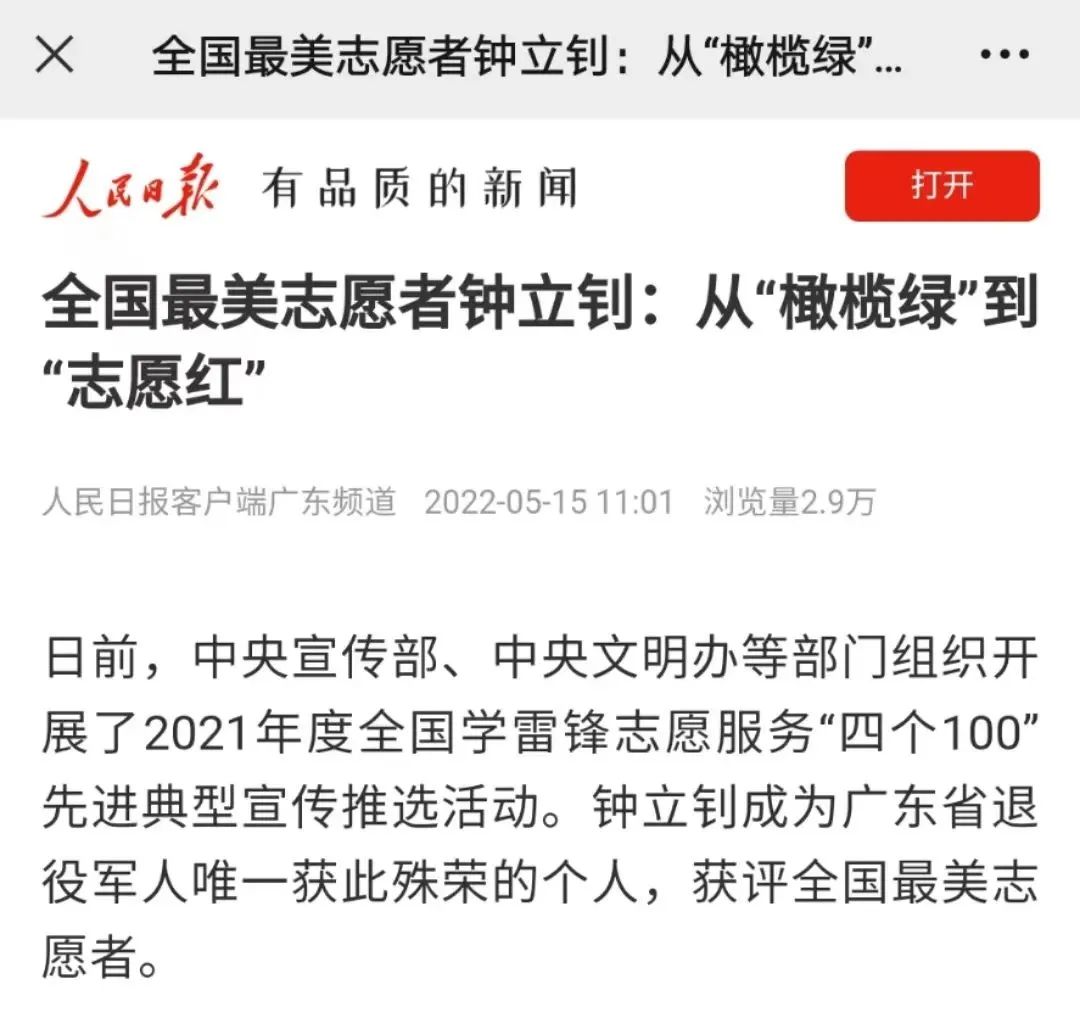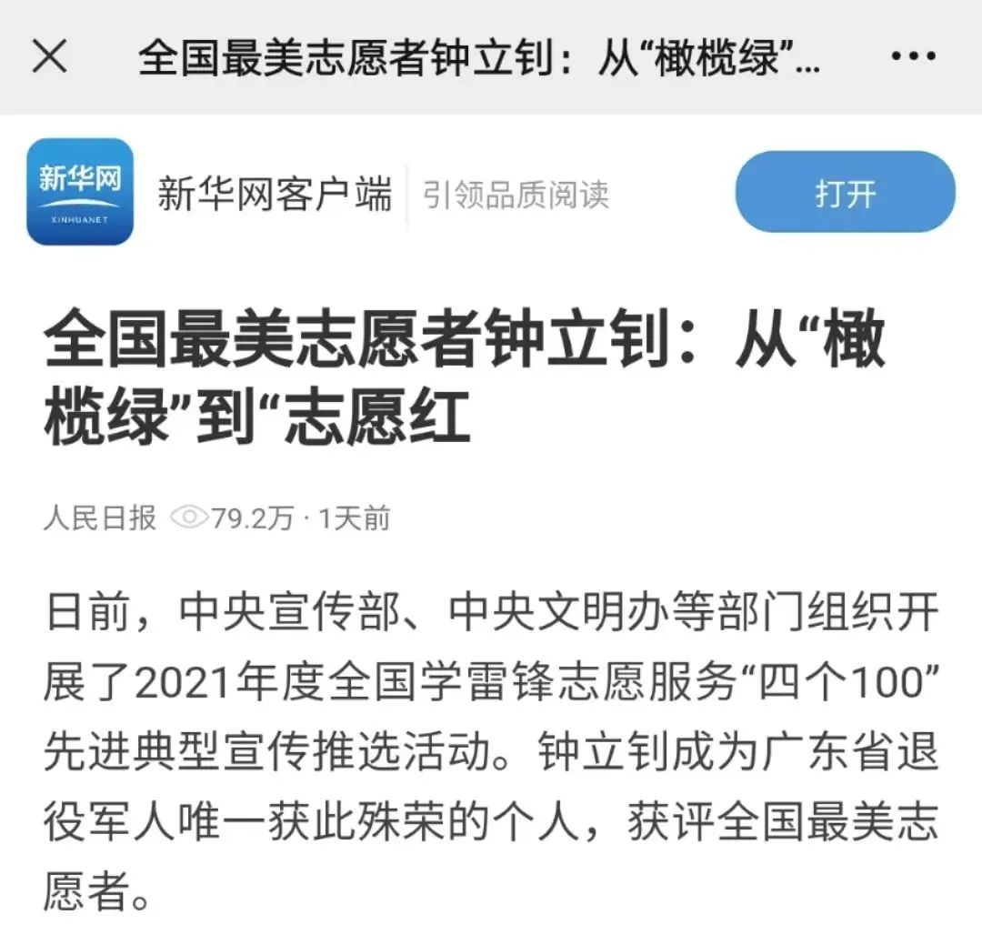 深圳市退役军人事务局——全省唯一!深圳退役军人钟立钊荣获全国学雷锋志愿服务“四个100”最美志愿者殊荣