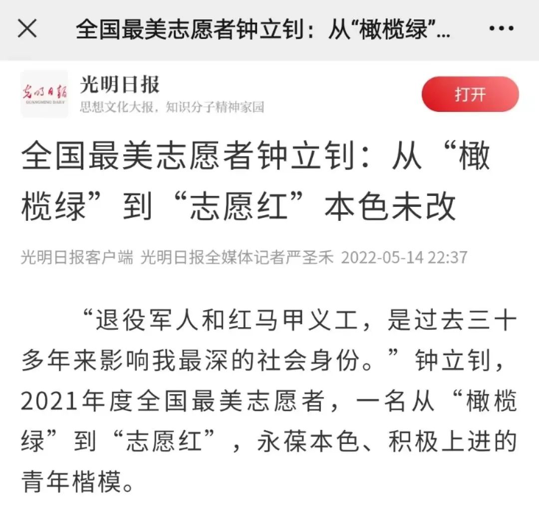 光明日报丨全国最美志愿者钟立钊:从“橄榄绿”到“志愿红”本色未改