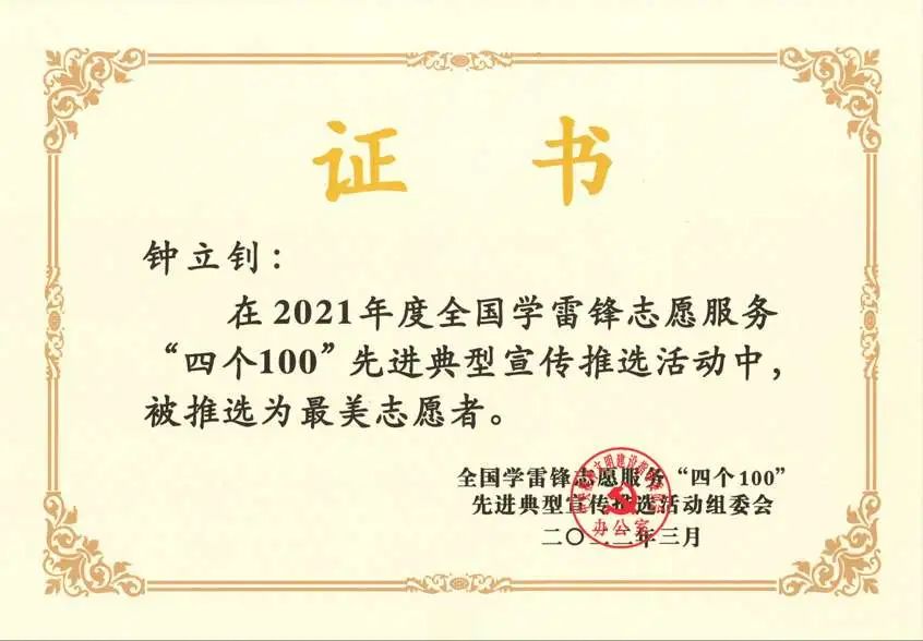据了解,日前,中央宣传部、中央文明办等部门组织开展了2021年度全国学雷锋志愿服务“四个100”先进典型宣传推选活动。经全国31个省、市、自治区和21个部委单位择优推荐、综合评选,钟立钊获评全国最美志愿者。他也是深圳市本年度、广东全省退役军人唯一获此殊荣的个人。
